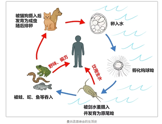 曼氏裂頭蚴的生命周期涉及多個(gè)宿主。成蟲主要寄生在貓、狗等動物腸道,產(chǎn)下的蟲卵隨糞便入水后孵化為幼蟲(鉤球蚴);幼蟲被水蚤吞食后在其體內(nèi)發(fā)育成原尾蚴;當(dāng)青蛙、魚或蛇攝入受感染的水蚤,原尾蚴在它們體內(nèi)進(jìn)一步發(fā)育成裂頭蚴;貓、狗等再食入攜帶裂頭蚴的蛙、魚或蛇,裂頭蚴便會在這些動物的腸道內(nèi)發(fā)育為成蟲,完成整個(gè)生命周期。