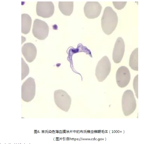 三是實驗室檢查病人血清中布氏錐蟲抗體是否陽性,病人血液、淋巴液、下疳抽吸液、骨髓穿刺液或腦脊液鏡檢中是否查見布氏錐蟲錐鞭毛體(如圖4),或布氏錐蟲核酸檢測陽性。
