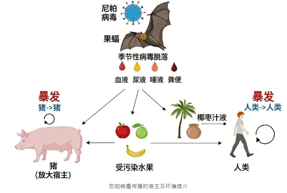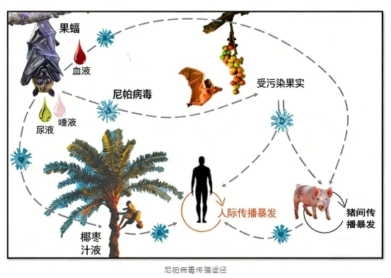 是一種人畜共患病毒,可以在動物和人之間傳播,最主要感染的兩種動物,就是我們?nèi)粘>湍芤姷?,甚至農(nóng)村地區(qū)還能時常接觸到的動物:果蝠和豬。