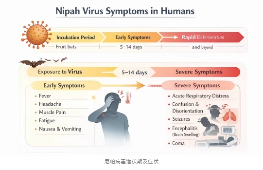 ?尼帕病毒一旦發(fā)展為重癥,可累及呼吸系統(tǒng)及神經(jīng)系統(tǒng)。