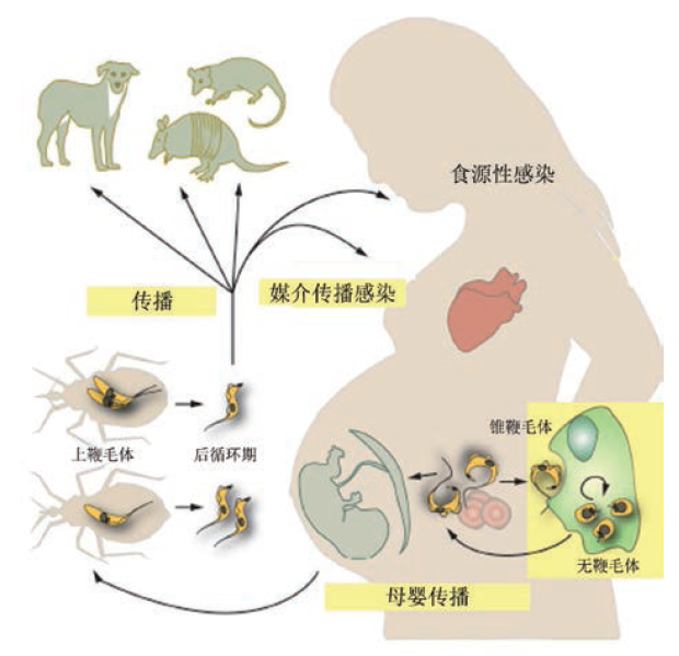 恰加斯病主要經(jīng)“接吻蟲”錐蝽傳染(圖 2),錐蝽夜間吸血時,不會直接通過唾液傳播,而是將含有克氏錐蟲的糞便排泄在人體皮膚上。當人被叮咬后抓撓,寄生蟲通過傷口或黏膜(如眼、口)侵入體內(nèi)??耸襄F蟲也可以通過輸血、器官移植和垂直傳播(母嬰傳播)。另外,亦可通過實驗室意外感染發(fā)病,食用受污染的食物或飲料傳播。(如圖3)